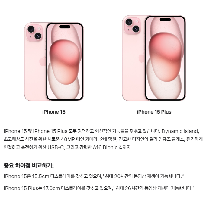 아이폰 15는 아이폰 15, 15 플러스, 15 프로, 15 프로 맥스 총 4종류이며 15와 15 프로가 같은 디스플레이 크기이고, 15 플러스와 15 프로 맥스가 같은 디스플레이 크기입니다. 일반 모델과 프로의 주요 차이점은 카메라와 외관 소재이고 기기 성능이 큰 차이점이 되겠습니다.
