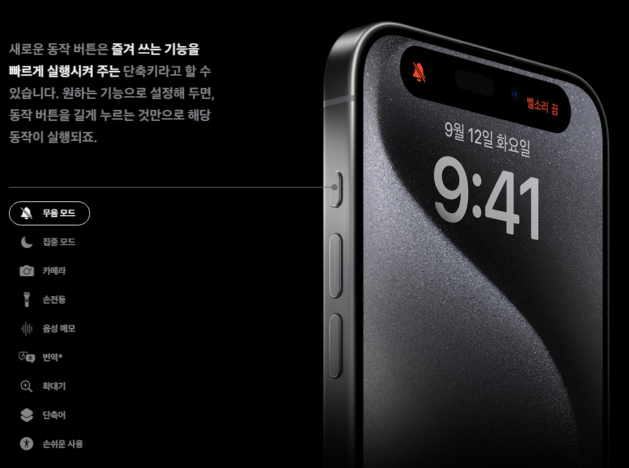 또, 기존의 아이폰에 있던 무음버튼이 새롭게 변하였습니다. 새로운 동작 버튼으로 바뀌어 원하는 버튼으로 설정할 수 있게 되었습니다. 카메라나 손전등 기능을 바로 켤수도 있고 단축어를 설정하여 원하는 앱을 실행 시킬 수 도 있습니다.